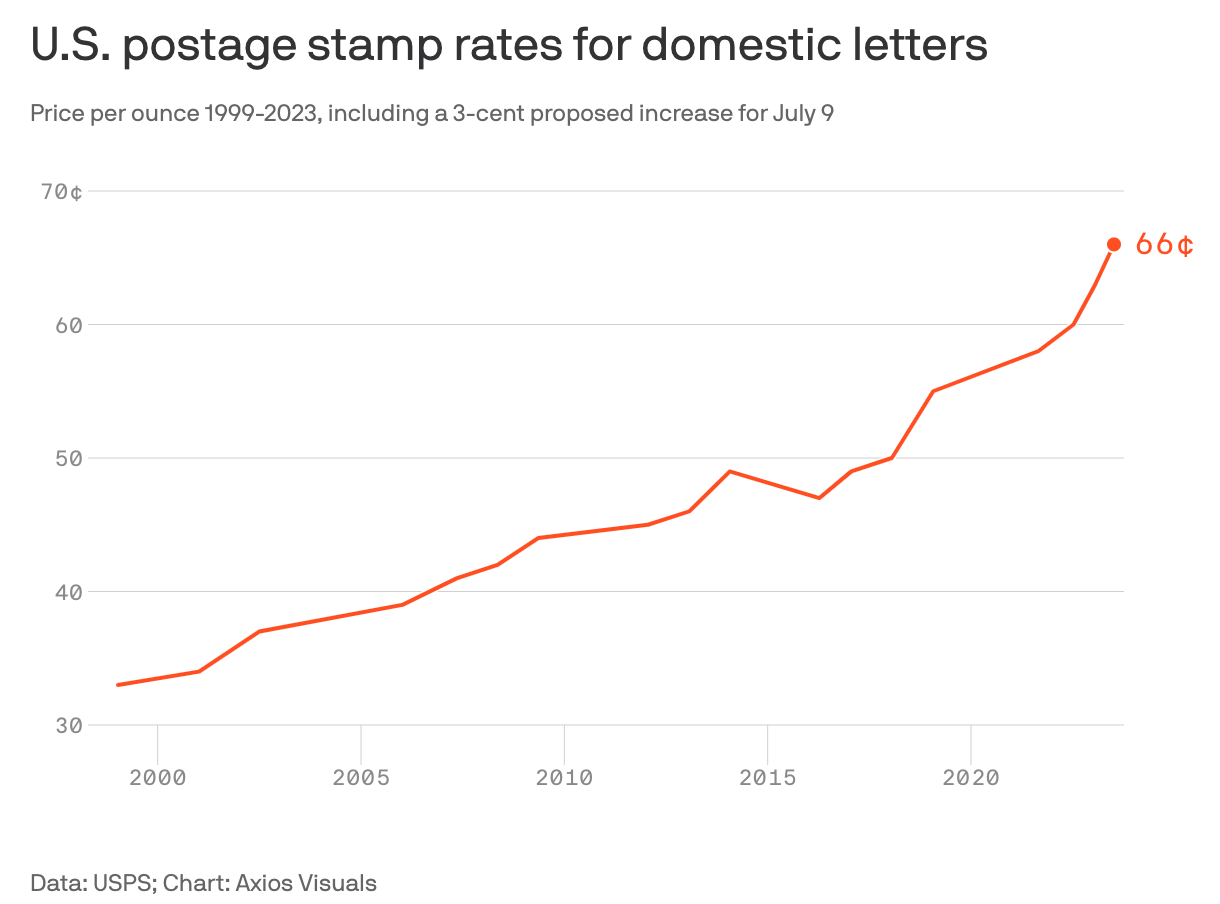 It’s pretty jarring. It looks and feels like a sharp ascent. In fact, the price of a stamp has essentially doubled since the late ‘90s!