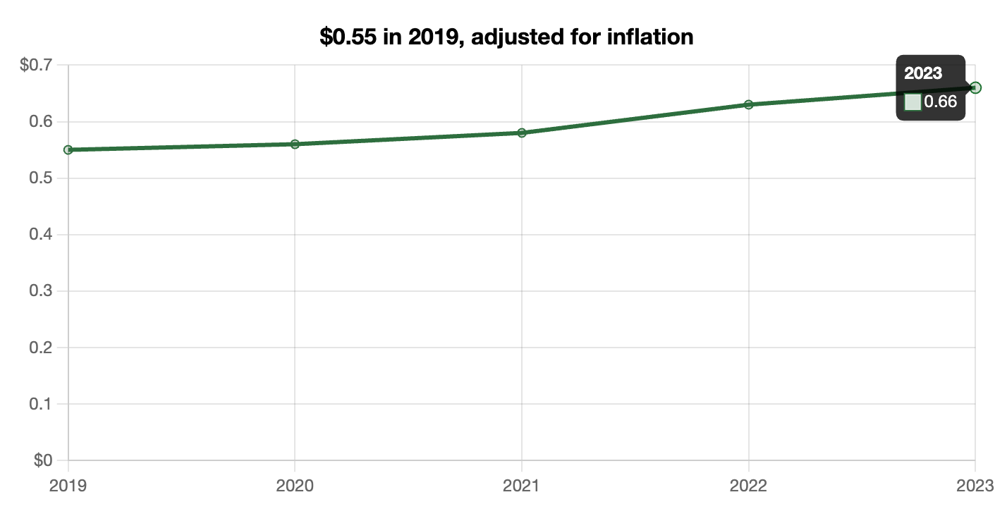 For example, the cost of a stamp in 2019 was 55 cents. Adjusted for inflation, depending on your exact calculation and inputs, that equates to 66 cents in 2023. Which happens to be the precise real cost of a stamp in 2023.